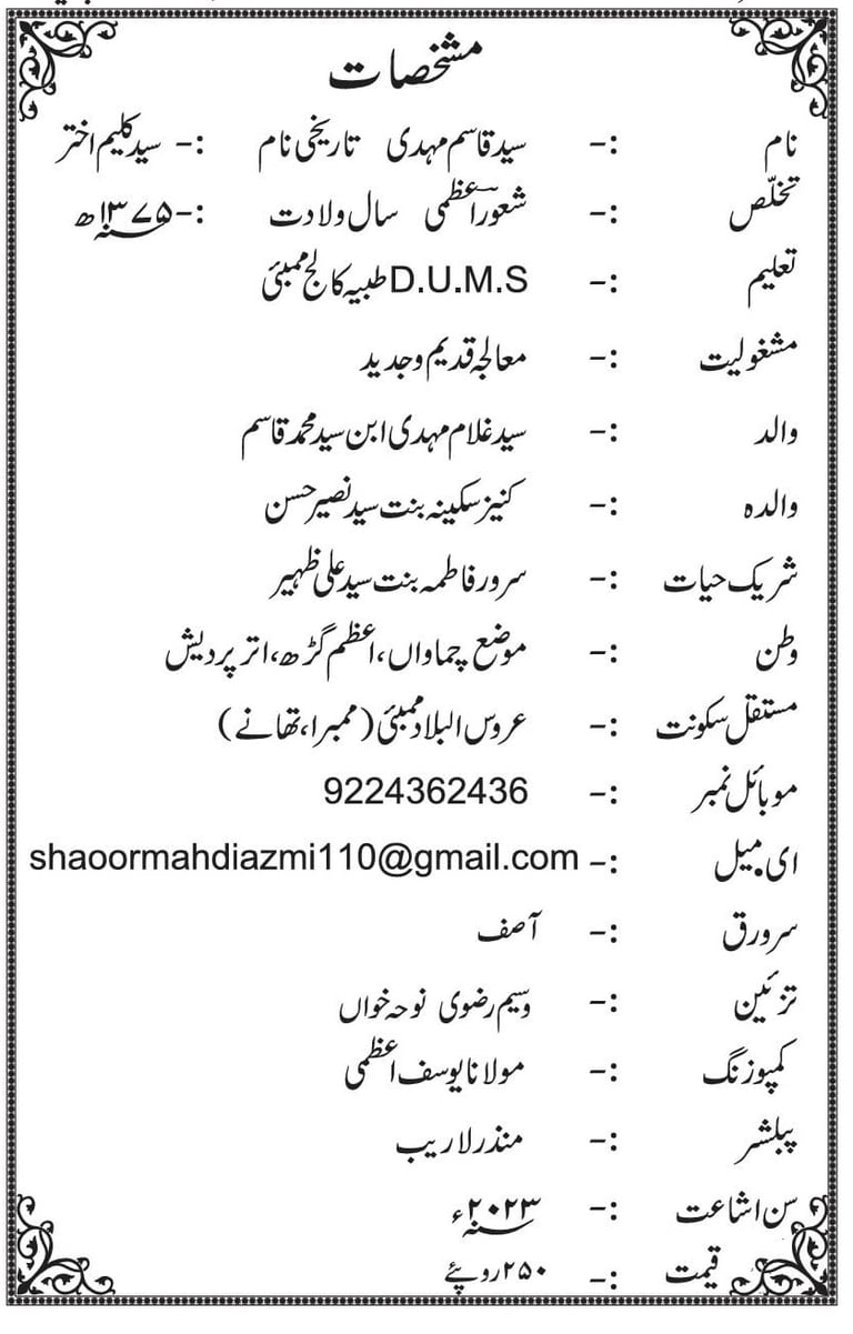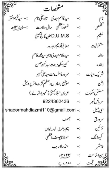 ڈاکٹر سید قاسم مہدی، جنہیں شاعری کی دنیا میں شعور اعظمی کے نام سے جانا جاتا ہے، ان کا شمار سر زمینِ ہندوستان کے استاد الشعراء میں ہوتا ہے۔ آپ کو علمِ عروض پر کمالِ فن حاصل ہے ۔ شعور اعظمی اردو شاعر، مصنف، اور مذہبی اسکالر بھی ہیں۔ ان کی شعورِ عروض B.A کے اور فرھنگِ شعور M.A کے شعبے اردو کے ممبئی یونیورسٹی کے نصاب میں شامل ہے ۔